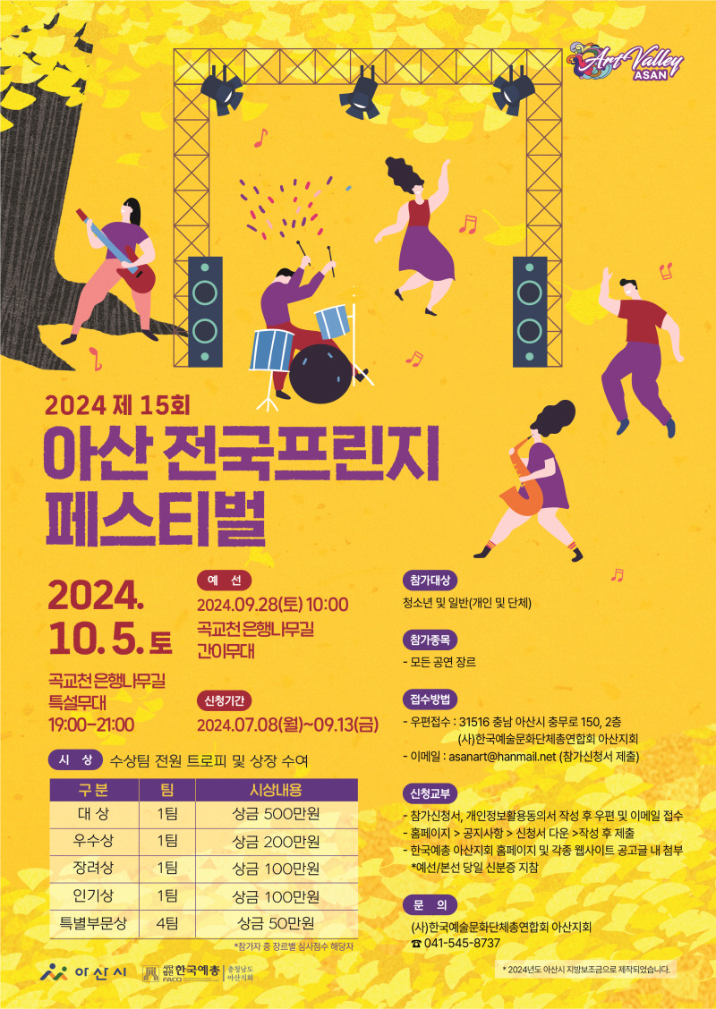 아산전국프린지페스티벌은 2024년 9월 28일부터 10월 5일까지 곡교천 은행나무길 특설무대에서 아산시가 주최하고 (사)한국예술무노하단체총연합회 아산지회 주관으로 펼쳐진다. 올해로 15회 개최에 빛나는 아산 전국프린지 페스티벌은 전국의 많은 공연팀들이 참여하여 경연을 펼치는 페스티벌이다. 청소년 및 문화 예술 향유자들의 문화 표현 기회 제공과 건전한 문화 형성 기반 조성을 위해 기획되었으며 전 국민을 대상으로 장르에 구분 없이 아마추어에서 전문 단체에 이르기까지 자유롭게 참여할 수 있는 축제이다.