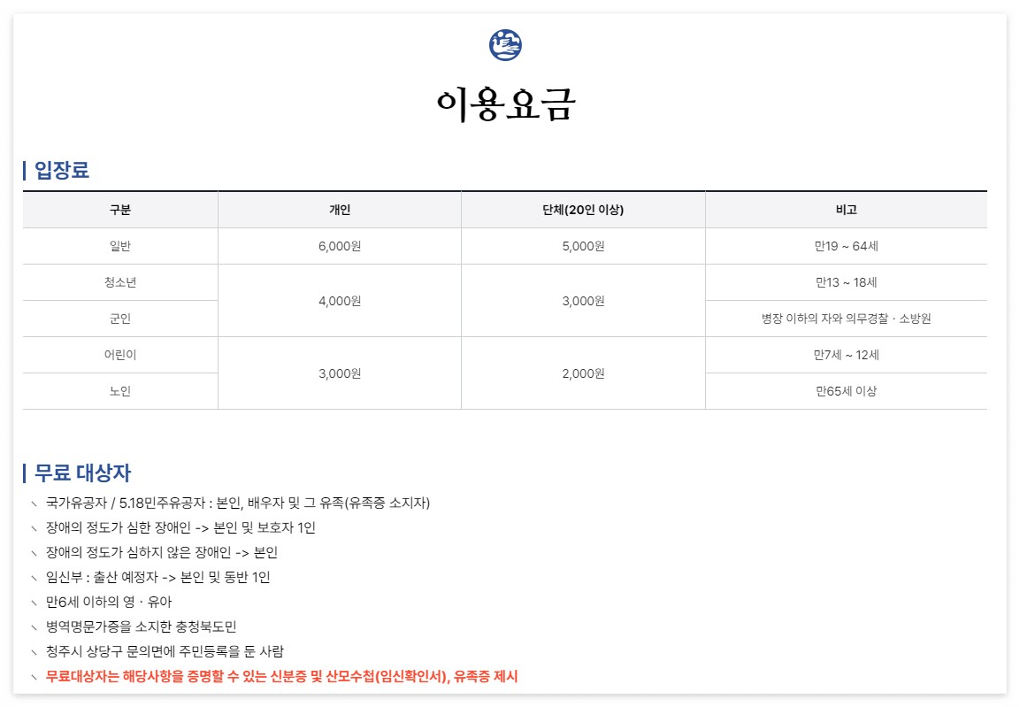 청남대 이용요금은 만 19세 이상 64세 미만 일반은 6,000원, 만 13세 ~ 18세 까지 청소년과 군인은 4,000원, 만 7세 ~ 12세까지 어린이와 만65세 이상 노인은 3,000원이다. 20인 이상 단체의 경우 할인 요금이 적용되며 각 요금에서 1,000원 할인 요금을 적용받는다. 청남대 주차장 이용 시 주차요금은 버스의 경우 3,000원, 승용차는 2,000원, 경차는 1,000원이며 이륜차는 무료로 주차가 가능하다.