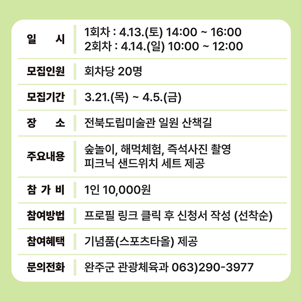 주요 프로그램으로 국민운동본부 박동창 회장과 함께하는 모악산 맨발 걷기, 모악산-구이저수지 일대를 한눈에 내려 볼 수 있는 열기구 탑승 체험, 도립미술관 일원 소나무숲, 산책로를 활용한 피크닉 활동 모악산 숲크닉, 술테마박물관 관람 및 술빵체험을 포함한 구이저수지 둘레길 걷기, 안덕마을 건강행복체험에 토속한증막 체험, 면역쑥뜸, 한의원 기본진료 등이 마련된다.