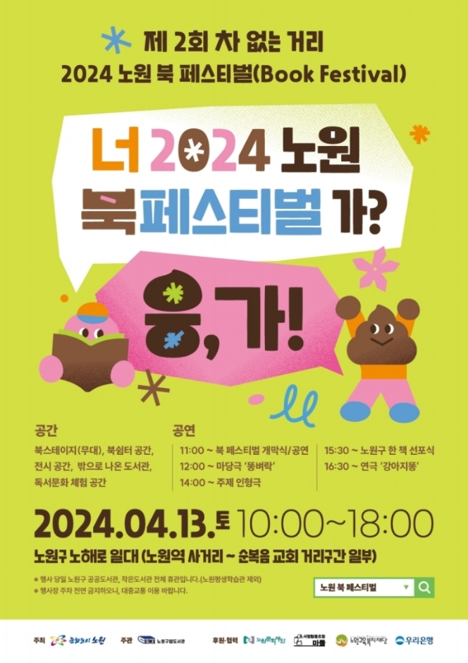 노원 북 페스티벌은 2024년 4월 13일 10시부터 17시까지 노원역 사거리에서 순복음교회 거리 구간에서 펼쳐진다. 2024 노원 북 페스티벌! 이번엔 차 없는 거리에서 시민들과 만남의 시간을 갖는다. 올해는 탄소중립을 중심으로 하여 '응가', '똥'을 테마로 자원순환과 관련한 다양한 행사를 진행한다. 북쉼터, 전시존, 체험존, 서점 마켓, 움직이는 도서관 등 다채로운 참여 행사와 어린이 그림책을 내용으로 하는 '똥벼락' 마당극부터 '강아지똥' 연극까지 기획공연이 시민들을 찾아간다.