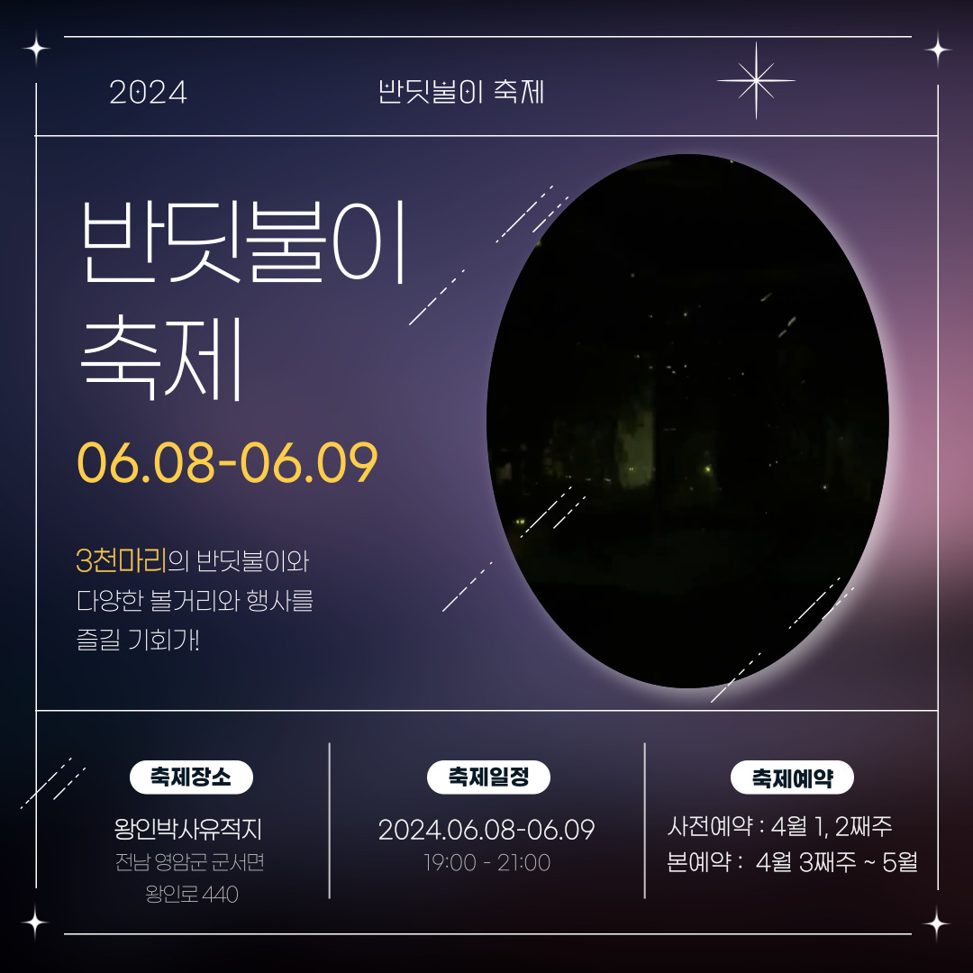 영암반딧불이 축제는 2024년 6월 8일부터 6월 9일까지 2일간 전남 영암군 군서변 왕인로 440의 왕인박사유적지에서 펼쳐진다. 오후 7시 15분에 마술공연 조선마술패, 8시 15분에 집결, 8시 30분에 별빛탐사대 3천마리 반딧불이, 9시 반딧불이 날리기 등으로 진행된다. 월출산 아래 초여름 영암의 밤을 반딧불이가 수를 놓는다.