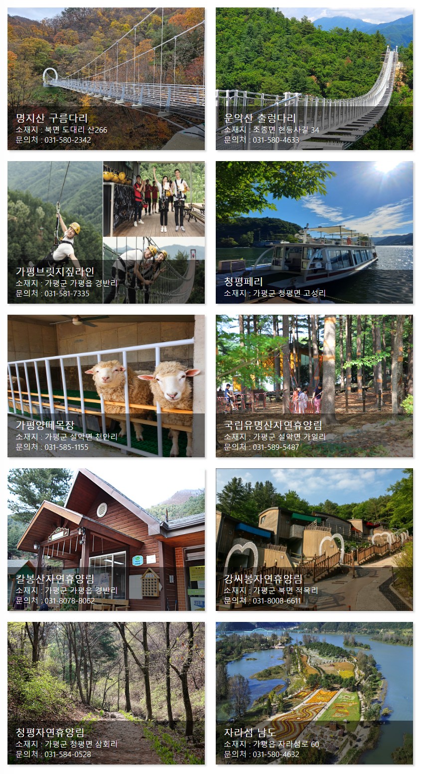 아침고요수목원이 자리잡고 있는 가평에는 다양한 가볼만한곳이 있다. 가평을 대표하는 가평 8경으로는 청평호반과 호명호수, 용추계곡과 명지산 단풍, 도마치계곡과 운악산, 축령산과 유명산 등이 있다. 가평에서 가볼만한 자연관광지로는 명지산 구름다리를 비롯하여 운악산 출렁다리와 가평브릿지짚라인 체험, 청평페리 관람, 가평 양떼목장과 국립유명산자연휴양림, 칼봉산자연휴양림과 강씨봉자연휴양림, 청평자연휴양림 등을 만날 수 있고 매번 다채로운 이벤트로 가득한 자라섬도 만날 수 있다.