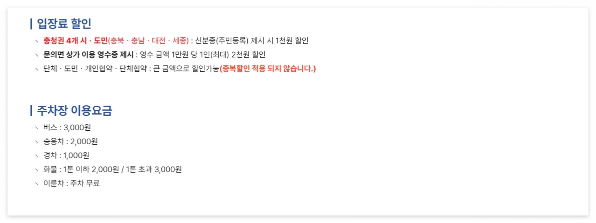 청남대 이용요금은 만 19세 이상 64세 미만 일반은 6,000원, 만 13세 ~ 18세 까지 청소년과 군인은 4,000원, 만 7세 ~ 12세까지 어린이와 만65세 이상 노인은 3,000원이다. 20인 이상 단체의 경우 할인 요금이 적용되며 각 요금에서 1,000원 할인 요금을 적용받는다. 청남대 주차장 이용 시 주차요금은 버스의 경우 3,000원, 승용차는 2,000원, 경차는 1,000원이며 이륜차는 무료로 주차가 가능하다.